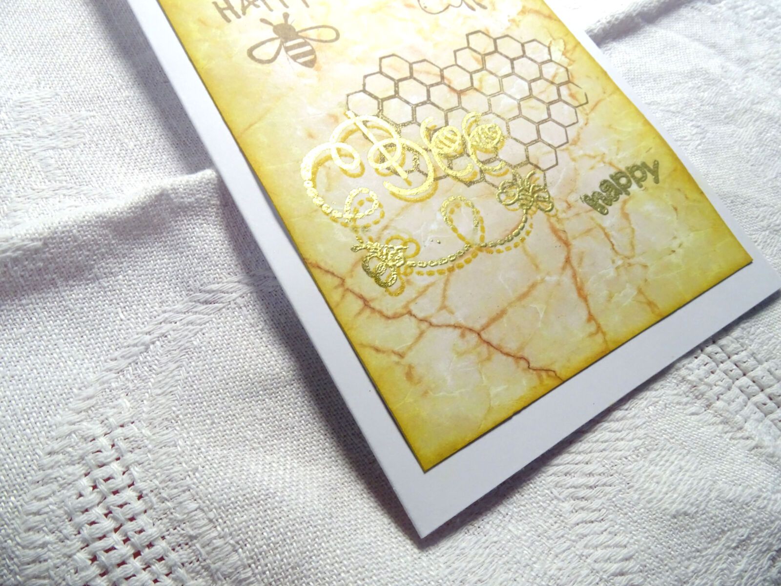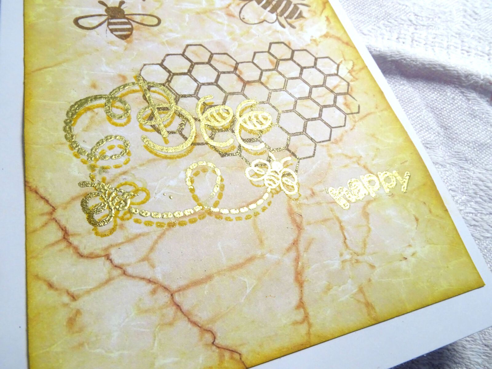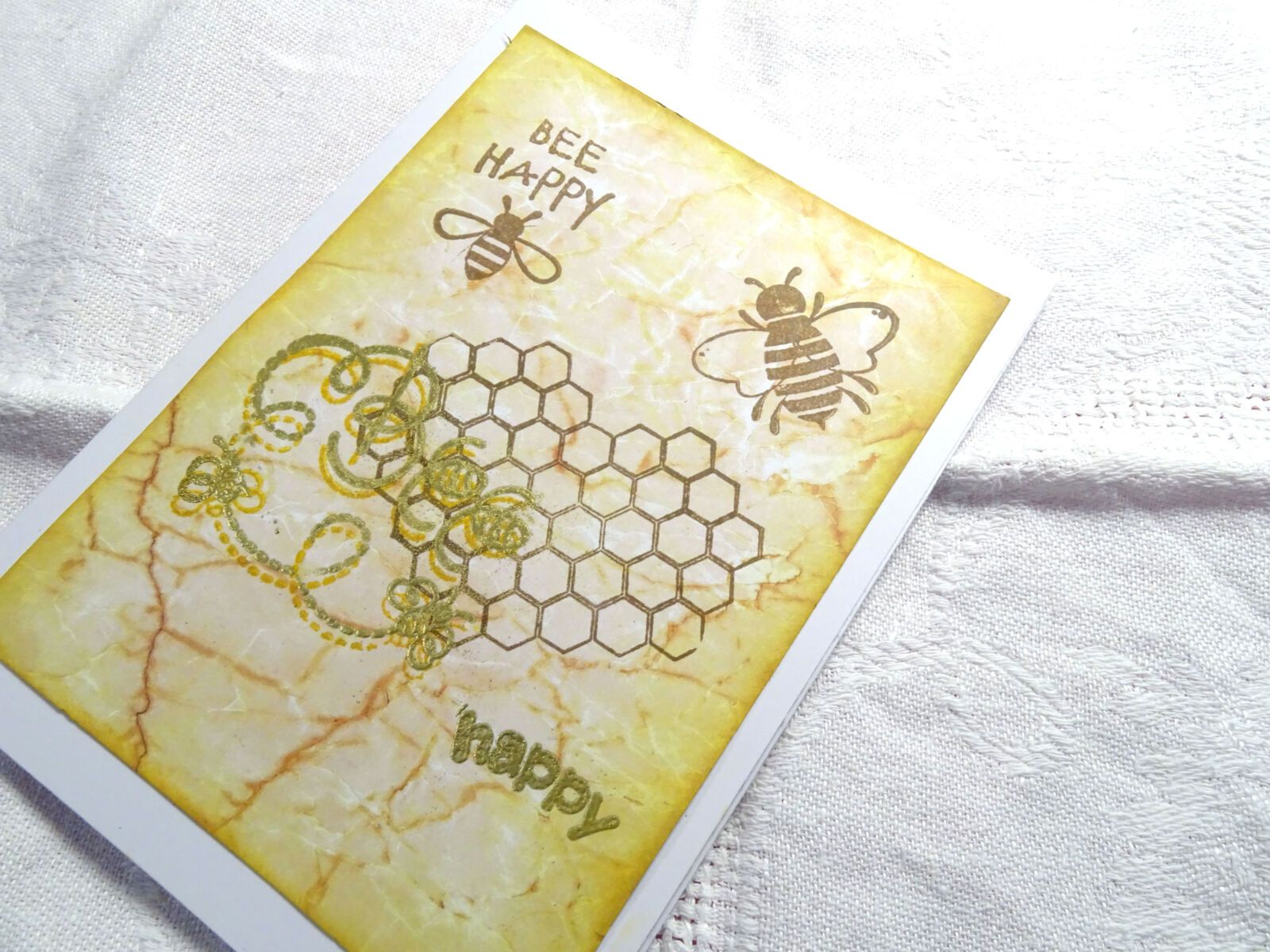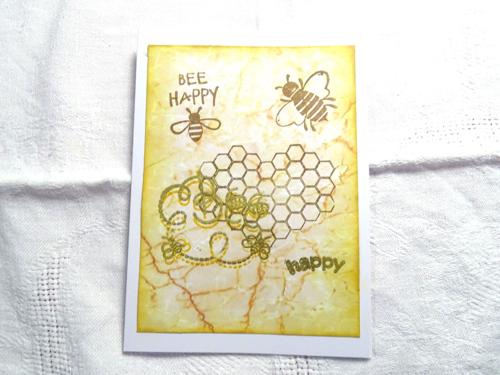 Un fond marbré qui rappelle un peu la cire que j'ai encré sur les bords . Un tamponnage coeur en alvéoles de ruche . Des tites nabeilles rigolotes deci-delà et un message embossé une fois en marron puis légèrement décalé pour faire ombrage, en doré . Et voilà bee happy !