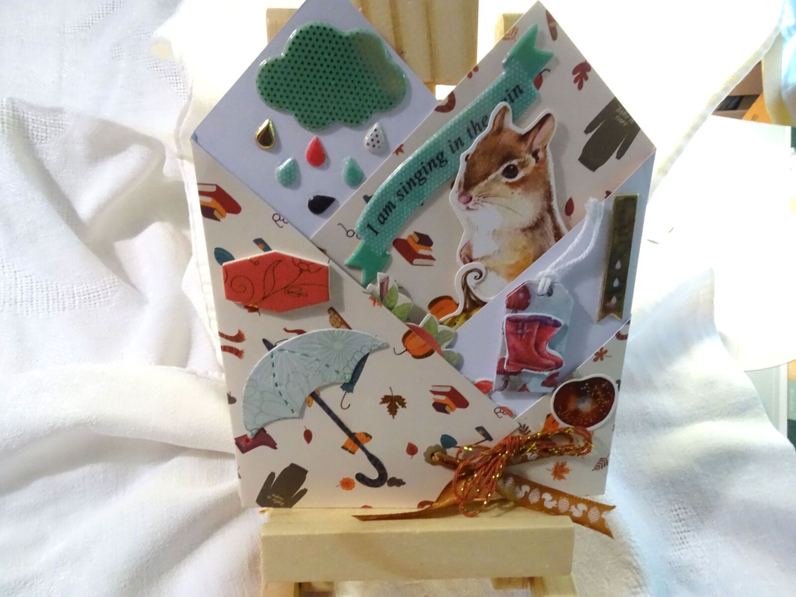Même papier que la pochette mais j'ai encré les bords pour plus de profondeur . J'ai ajouté un parapluie en relief au pull imprimé et comme çà on dirait que ce dernier tient ledit parapluie !
