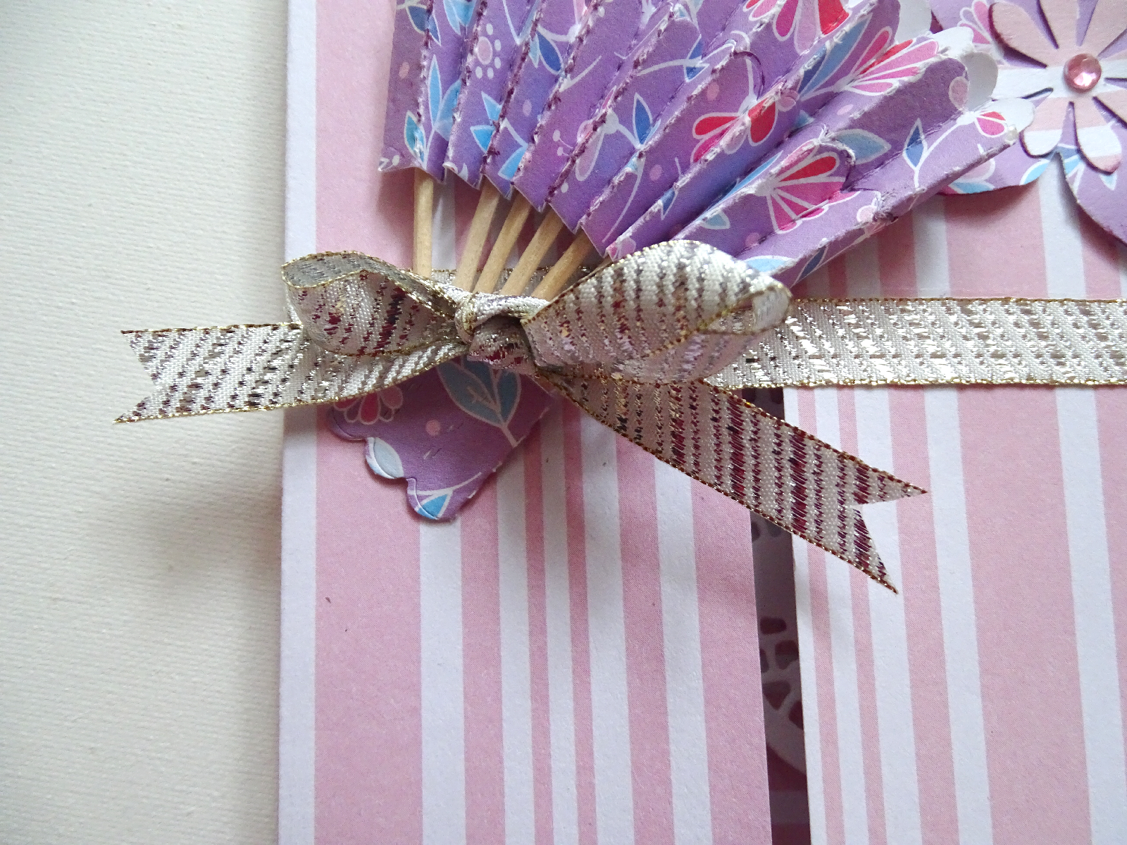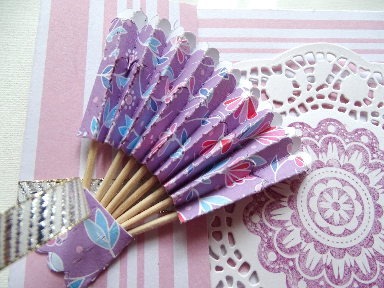 Un éventail fabriqué maison avec une die à l'origine faite pour faire une cocarde ... J'ai détourné le modèle pour faire la partie éventail en superposant la découpe coupée en deux et encrée sur les bords . J'ai fixé les plis avec des cure-dents rassemblés à la base pour ouvrir l'éventail . Puis collage généreux !