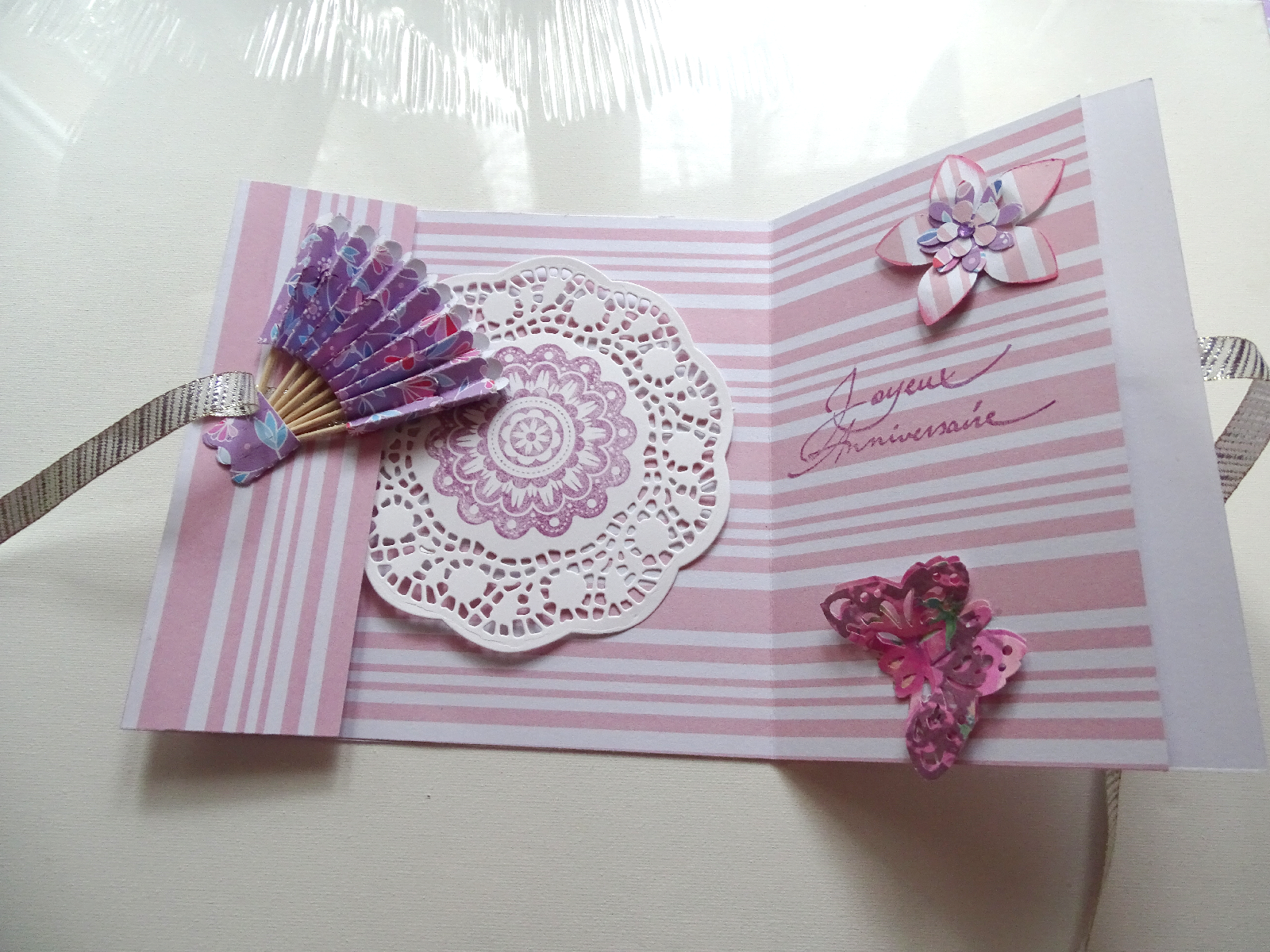 Voilà la carte fermée par un ruban argentée, prête à offrir ... J'aime bien ce format car la personne qui découvre sa carte est toujours impatiente de voir ce qu'il y a à l'intérieur ... hihihi !
