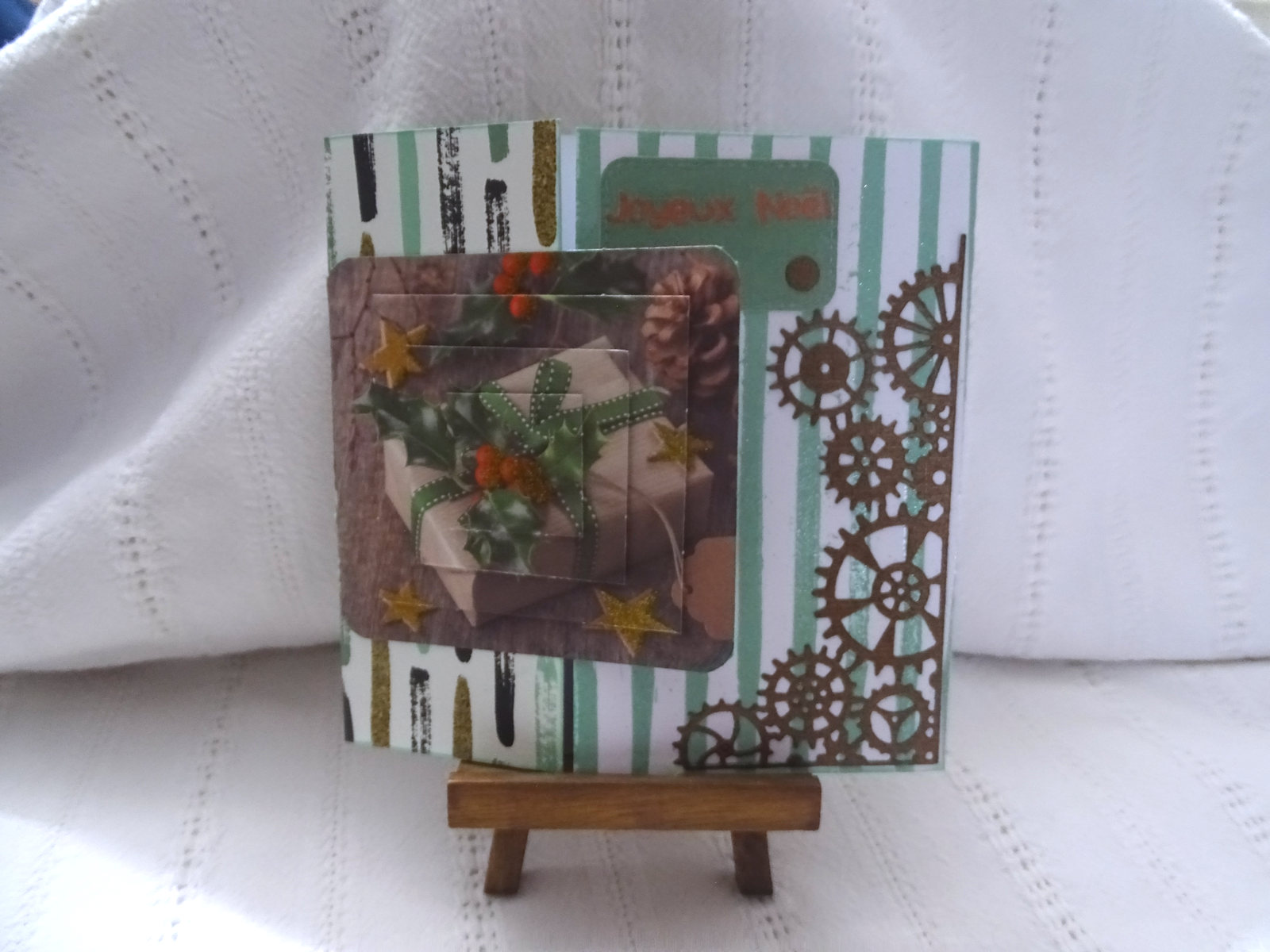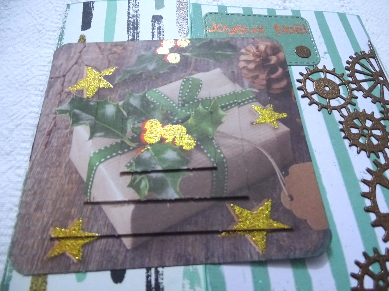 Tout d'abord une carte masculine faite avec un assemblage de deux papiers assortis ... L'un blanc à rayures vertes et l'autre avec des rayures tronquées ... Un engrenage cuivré pour le côté masculin, un montage 3D pour fermer la carte et une petite étiquette embossée en doré ...