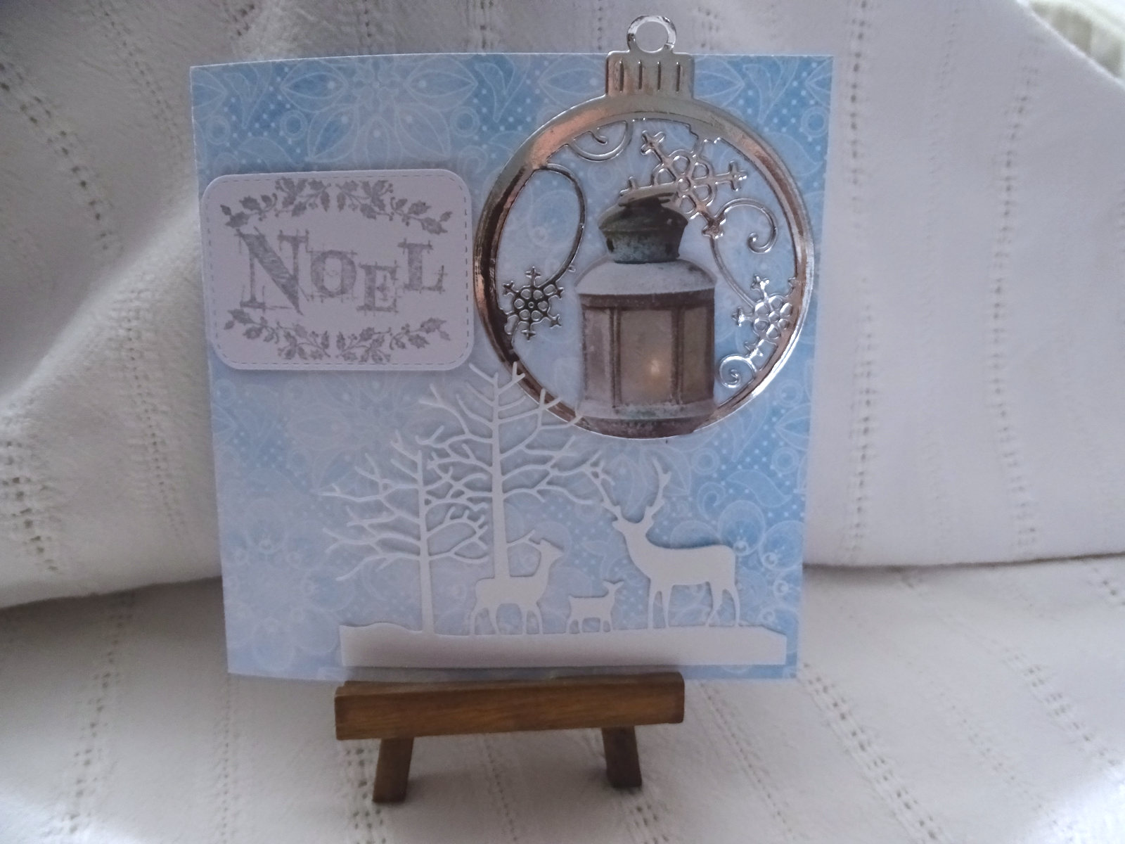 Un joli papier Fdéco comme support et un montage de die découpée dans du papier blanc d'une part et dans du papier argenté d'autre part . Une lanterne découpée et une grosse étiquette embossée argentée pour le message . Voilà pour l'extérieur de la carte . A l'intérieur une petite surprise avec une maison qui s'ouvre en même temps que la carte elle-même ...