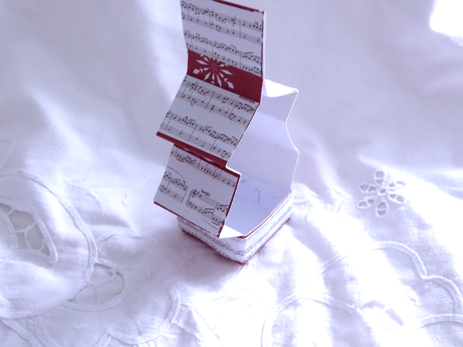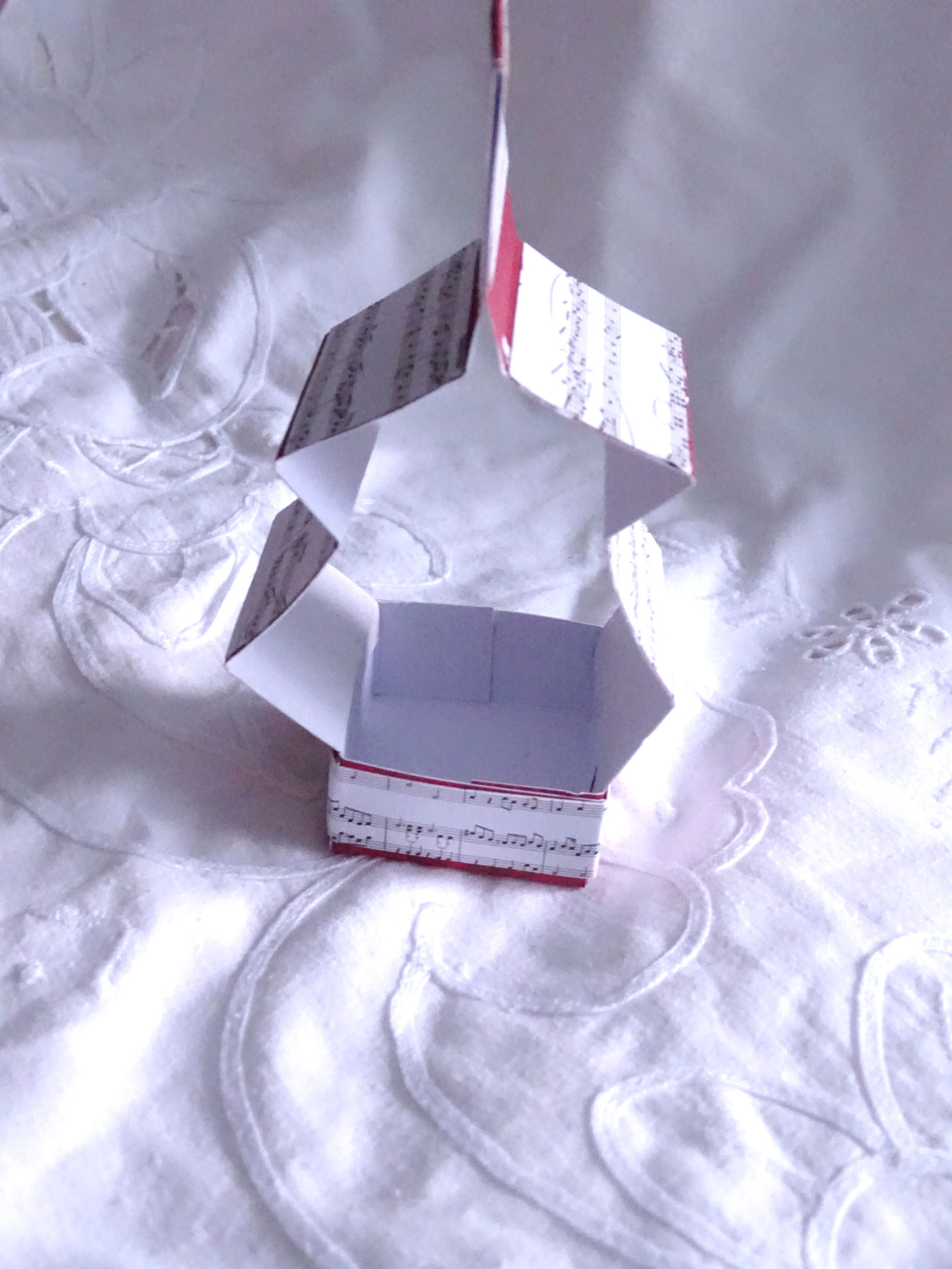 Ensuite il fallait suivre un tuto pour faire une jolie petite boîte pour un chocolat . Petite boîte qui pourrait, éventuellement, servir de marque-place .