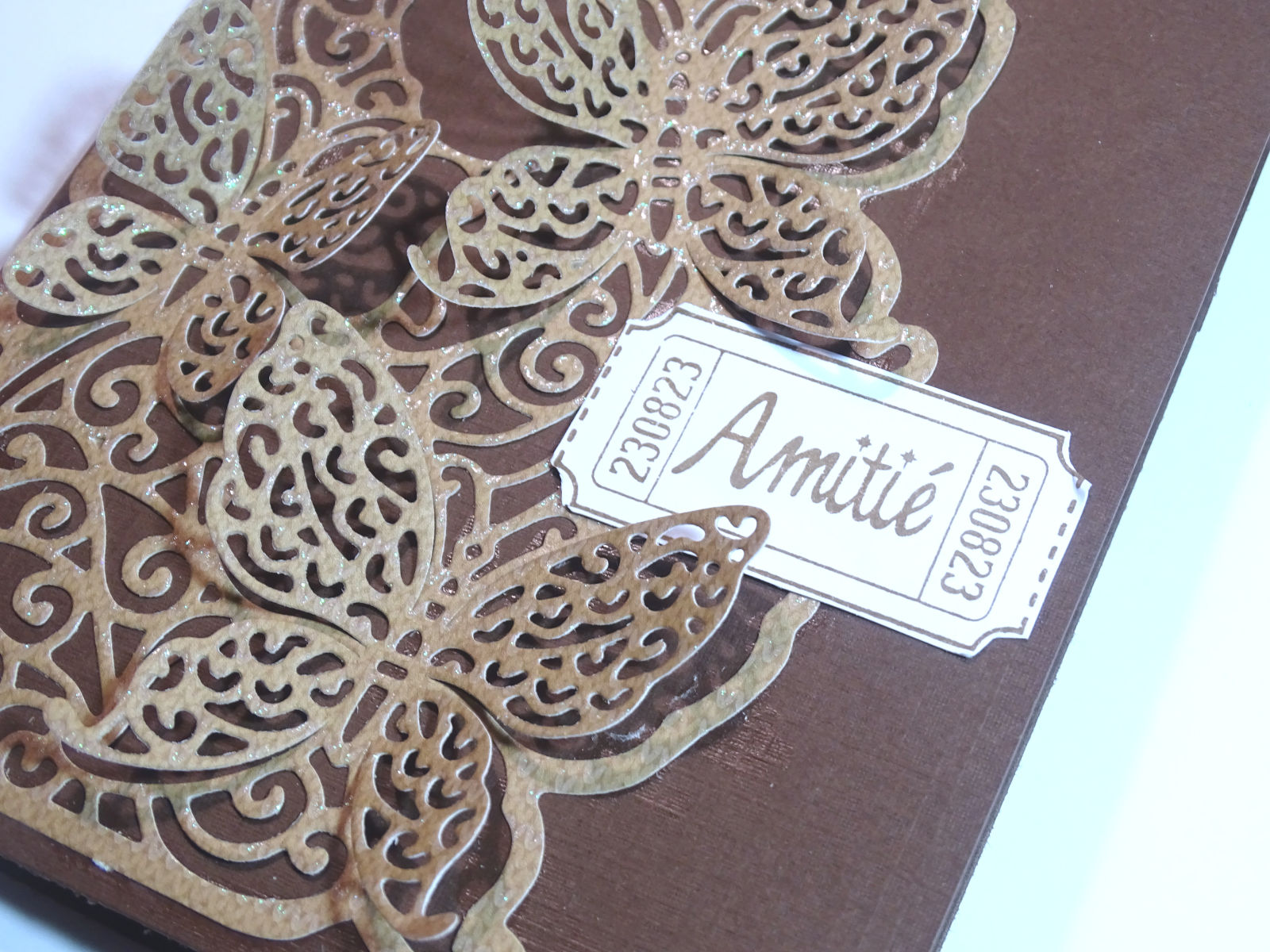 Là aussi j'ai utilisé un tampon ticket pour le sentiment et j'ai choisi cette die magnifique que j'ai découpée dans un papier légèrement imprimée de doré .