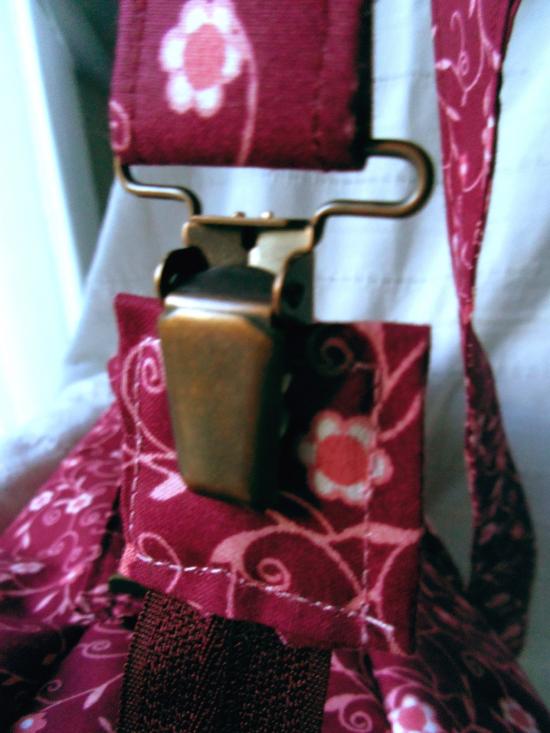 Comme la bandoulière devait être amovible, j'ai décidé de la fixer à l'aide de pinces bretelles qui pincent justement une petite languette que j'ai posée sur le bord du zip de chaque côté ... Bien solide comme çà ! Et si la dame veut ranger la bandoulière, au moins la fixation est discrète !