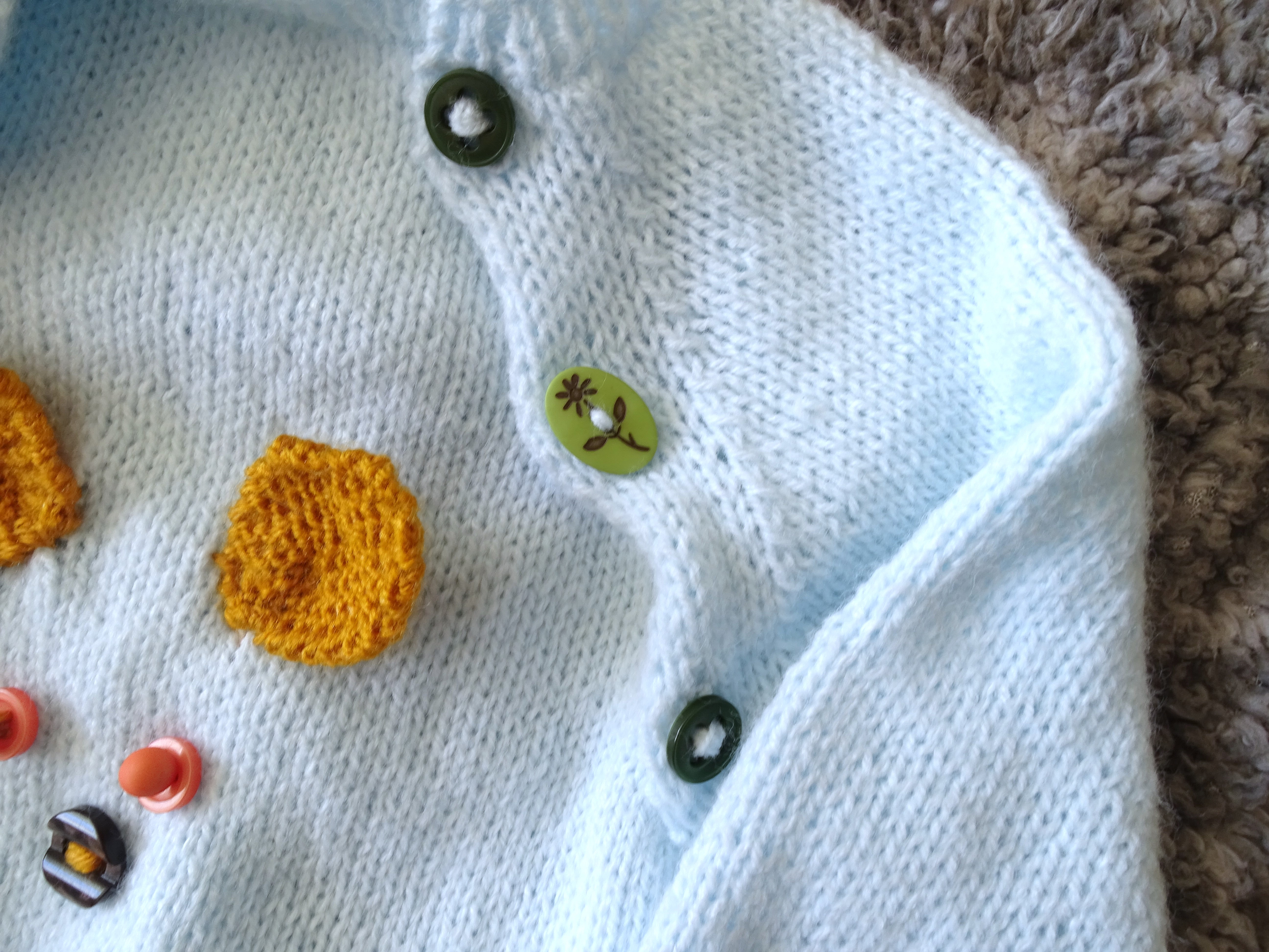 Pour faire les yeux et le museau de la bébête j'ai choisi des boutons que j'ai fixés solidement avec de la laine sur l'envers .